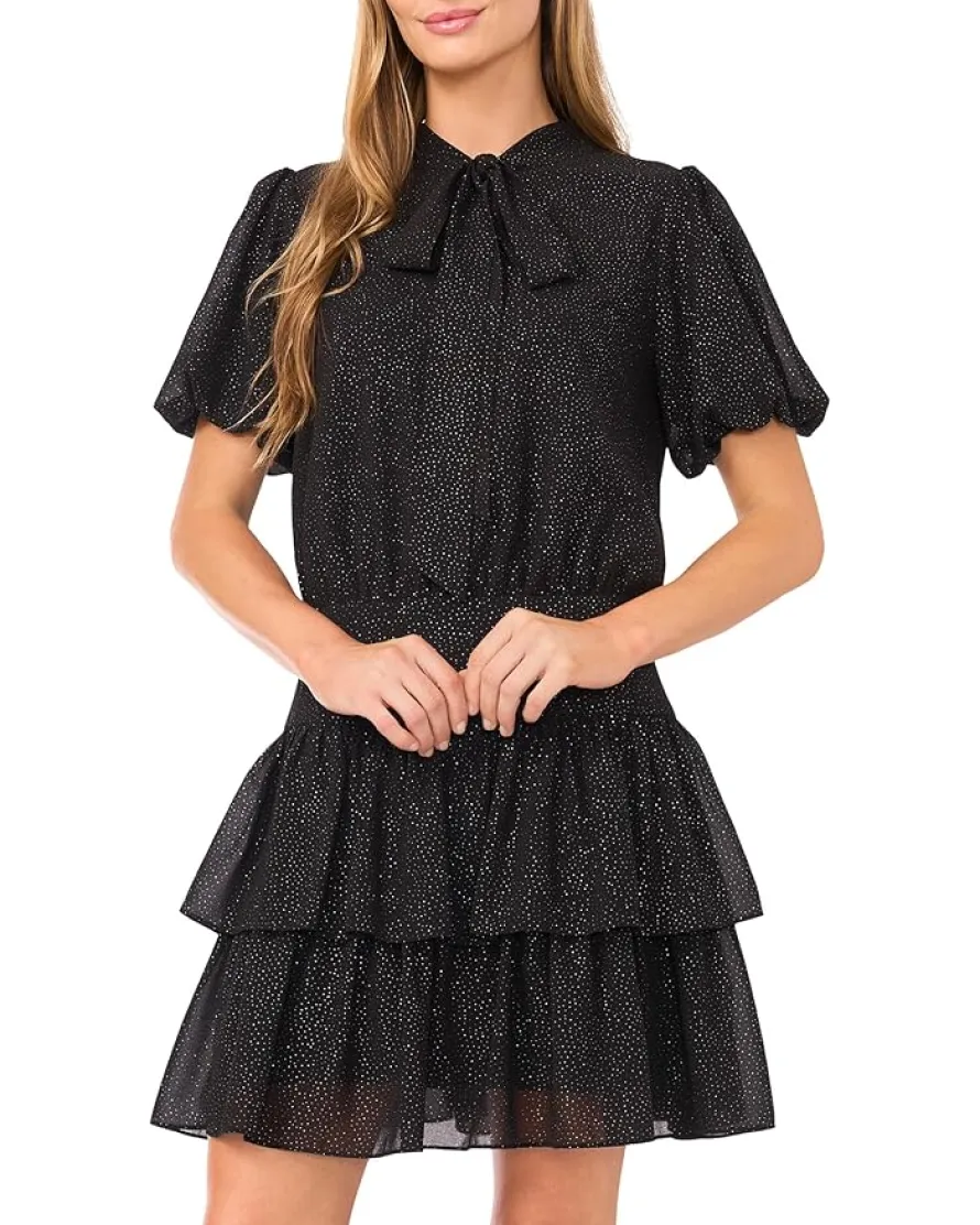 - Romantic and flirty, the CeCe™ Tie Neck Ruffled Tier Mini Dress features delicate ruffles at the hem, shirring, short puff sleeves, back-zipper closure, and a neck tie closure for added texture & glam. It is intended to hit above the knees.