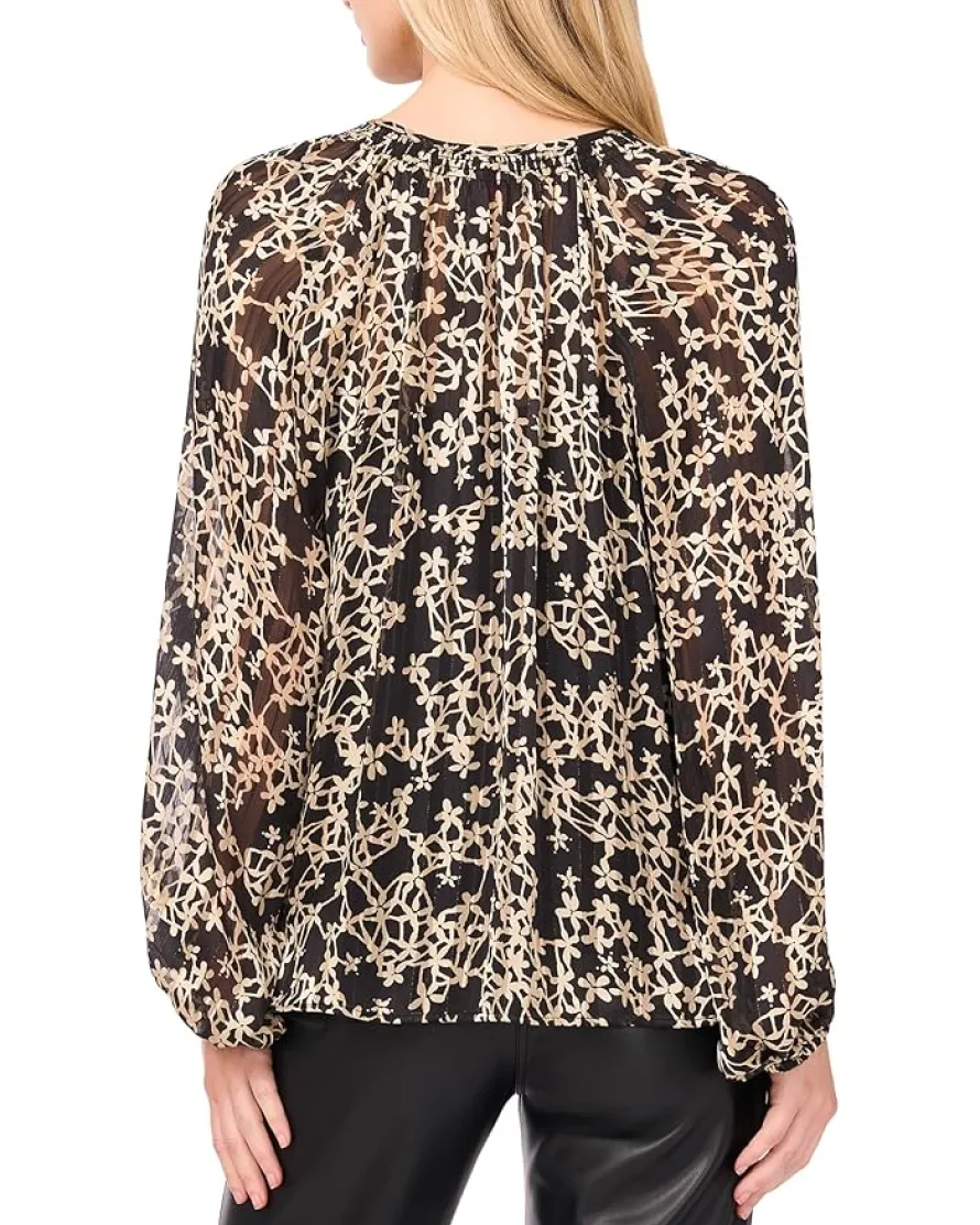 - Shine effortlessly wearing the Vince Camuto® Tie Neck Shirring Long Sleeve Top, while elegance meets comfort. The pull-on style top features a V-neckline with tie-up detail, long sleeves, a straight hem, and a subtle allover print.