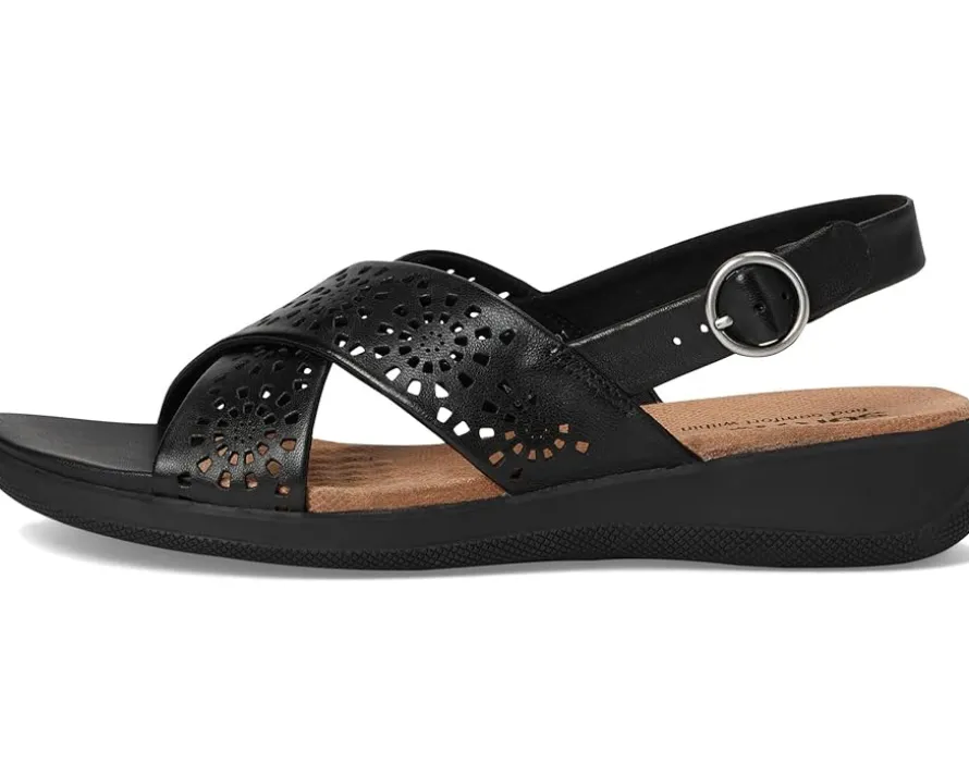 - Elevate your footwear collection with the Softwalk® Tillman Sling Perf Sandal, a perfect fusion of style, comfort, and functionality. Crafted from leather upper, lining, and insole, this pair of sandals features round toe, crisscross strap detailing on the vamp, adjustable strap with buckled closure, and low-block heel.