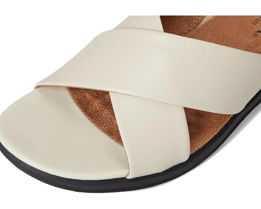 - Genuine leather upper features an open toe with crisscrossing straps.