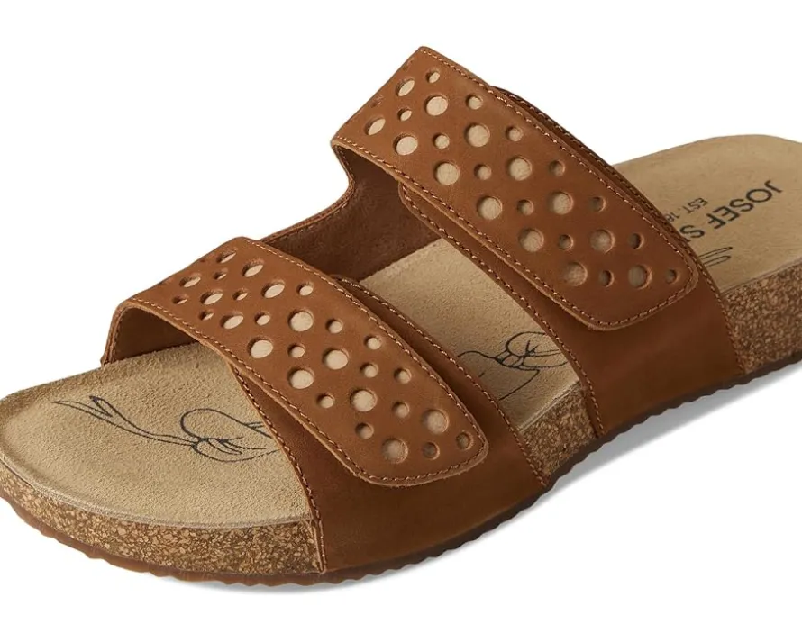 - Take every step forward with improved style and comfort wearing Josef Seibel® Tonga 86 Sandals. The slip-on style sandals are crafted with a leather upper with clean lines & two adjustable hook-and-loop straps, leather lining, a polyester insole, and a cork or latex midsole. The TPU outsole ensures a secure grip & flexibility while the padded & contoured footbed is suede-lined for enhanced comfort.