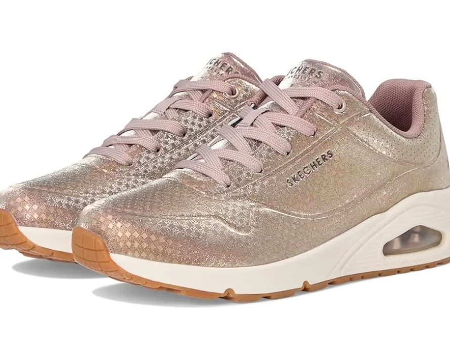 - Step into the groove with SKECHERS® Uno – Disco Nite, a fashion-forward sneaker that blends retro sparkle with modern comfort. This lace-up style features a synthetic disco glitter upper that catches the light with every move, while the Skechers Air-Cooled Memory Foam® insole delivers breathable cushioning and pressure relief. The standout Skech-Air® visible airbag midsole adds a cloud-like bounce to your stride, complemented by a flexible rubber traction outsole for everyday grip.