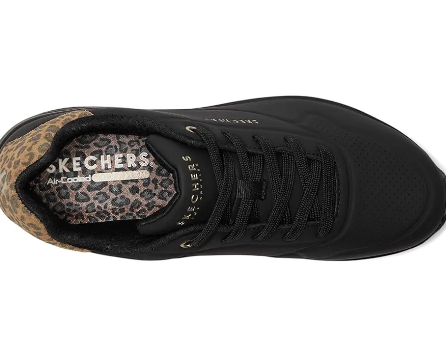 - The SKECHERS® Uno – Jungle Nite shoes bring fierce flair to cloud-like comfort. Designed with a smooth synthetic Durabuck upper and leopard-print heel mustache, they blend bold street style with everyday ease. The Skech-Air® visible air-cushioned midsole delivers that signature “walking on air” feel, while the Air-Cooled Memory Foam® insole keeps things breathable and plush. A flexible rubber traction outsole and hidden wedge heel round out the look with subtle lift and all-day support.