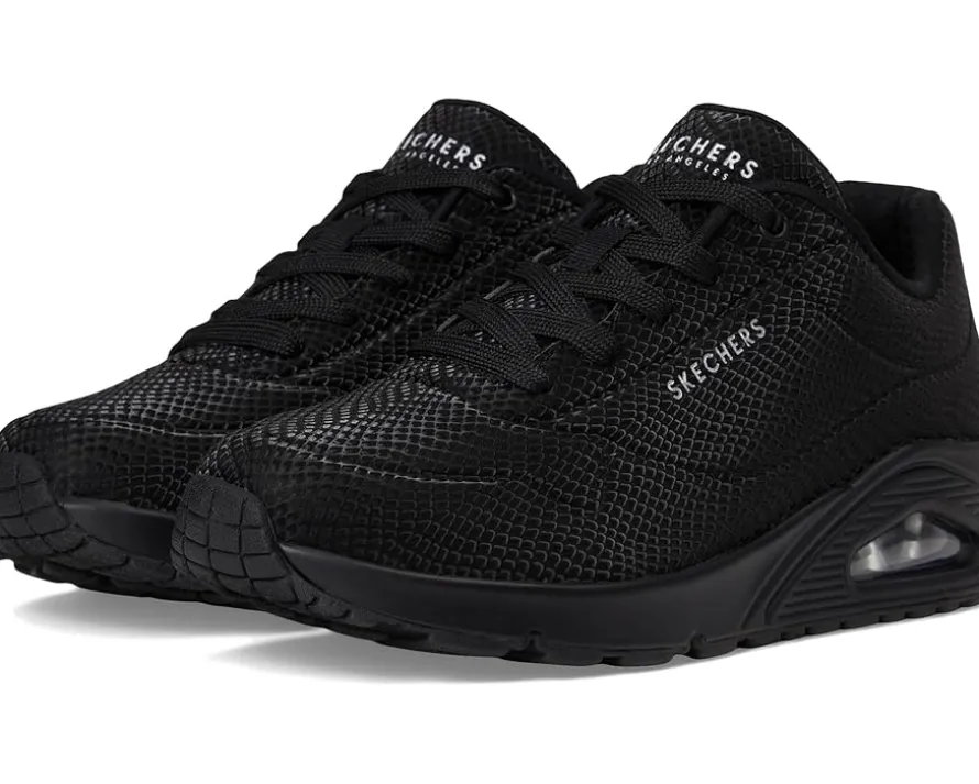 - Step into the groove with the SKECHERS® Uno – Shiny Scale shoes. These fashion sneakers feature a lace-up polyurethane reflective upper, Skechers Air-cooled Memory Foam® insole, and a visible, air-infused Skech-Air midsole that gives you the feeling of walking on clouds, everywhere you go. The polyester lining offers added comfort. Experience cushioning and exceptional support with their signature comfort technology. Take to the air in a variety of lightweight styles and comfortable cushioning you can feel with these lace-up sneakers.
