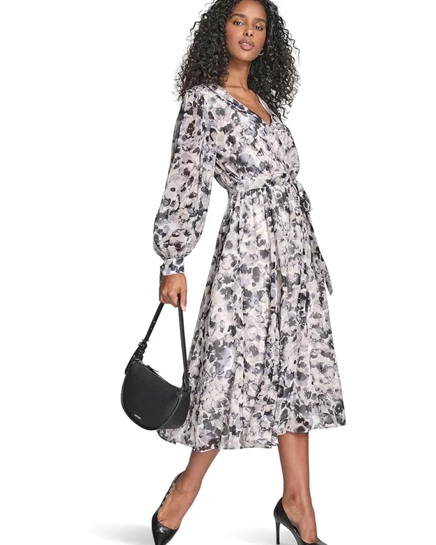 - The Calvin Klein® V-Neck Long Sleeve Chiffon Midi dress.