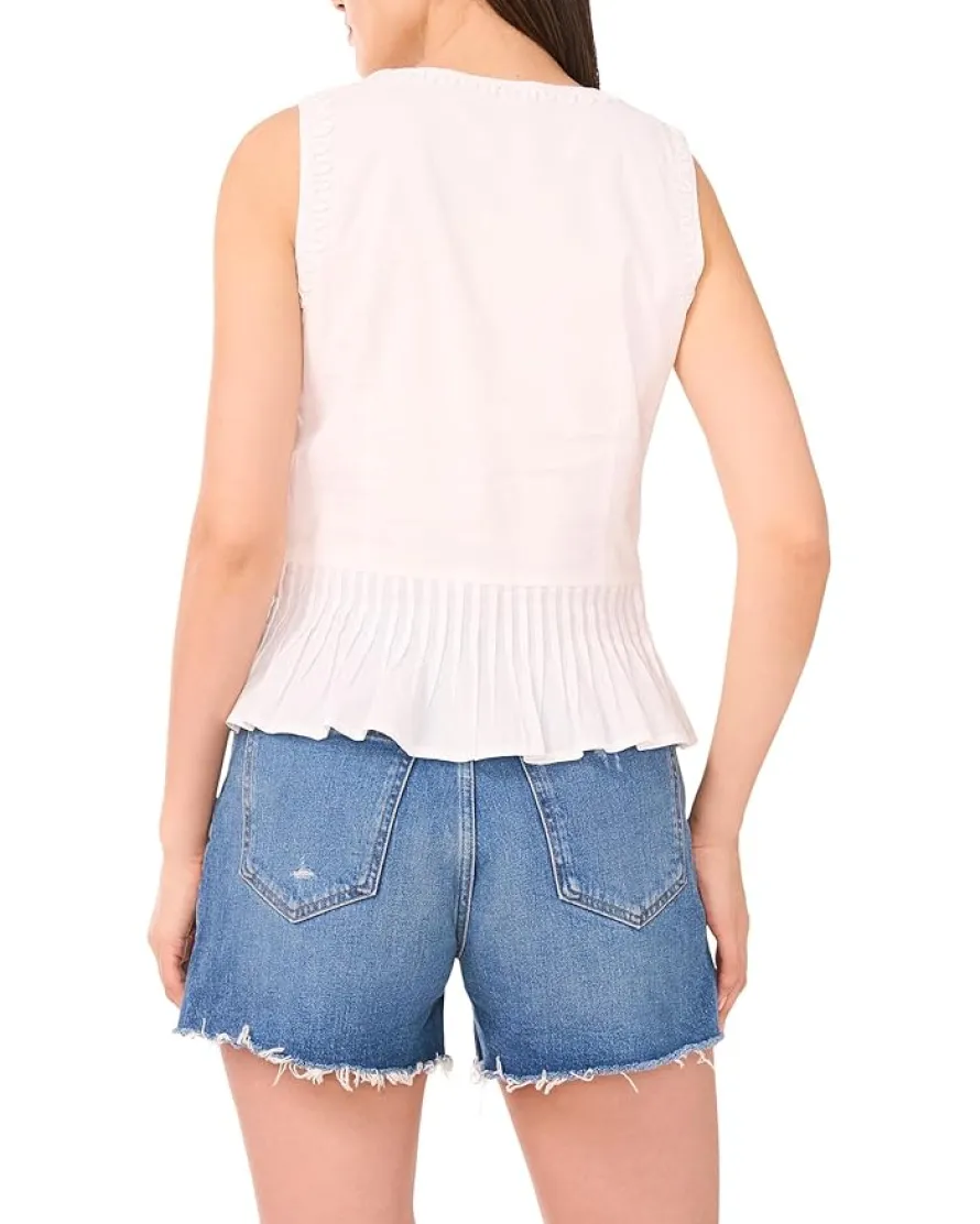 - Get ready to turn heads wearing Vince Camuto® V-Neck Tank Peplum With Pleats! This tank top features a classic V-neckline and a trendy peplum hem that creates a flattering silhouette. The pleat detail adds an extra dimension to the design, while the buttoned front hem gives it a sophisticated touch. Whether you’re heading to the office or out for a night on the town, this top is sure to make a statement.