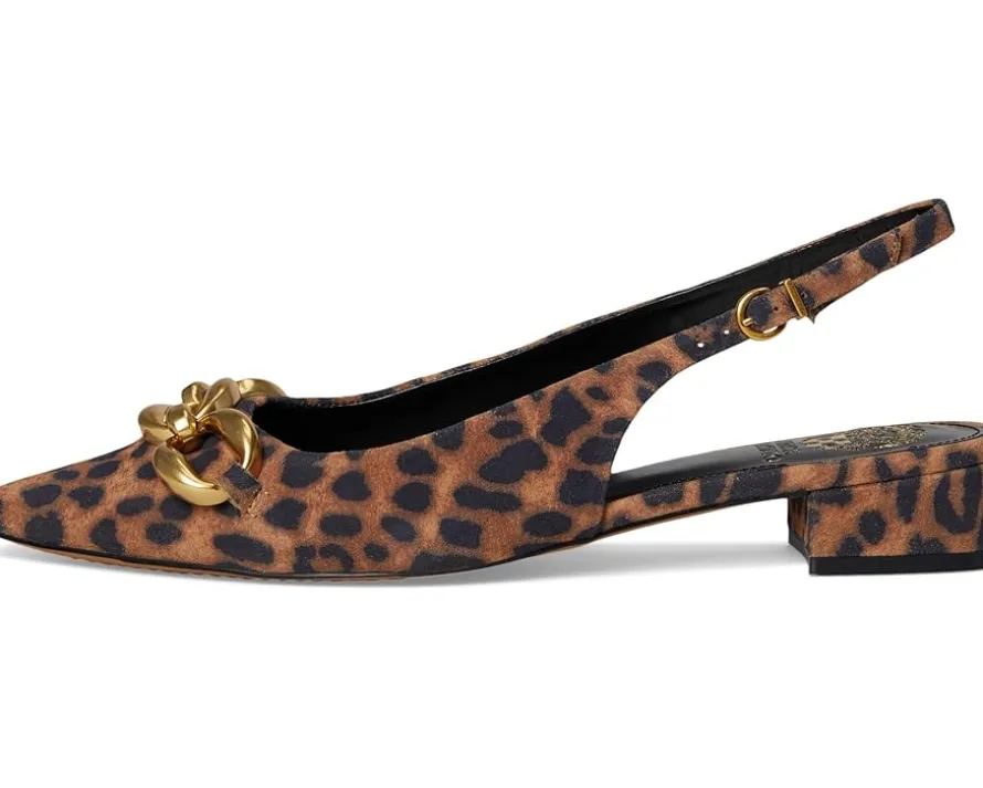 - Stride with sleek confidence styling in Vince Camuto® Valiey Chain Link Slingback Mule. Crafted with a faux leather upper and luxe gold-tone chain embellishment, these mules bring undeniable edge to any outfit. The sharply pointed toe creates a polished silhouette, while the low block heel gives you all-day wearability without sacrificing style. An adjustable buckle slingback ensures a snug fit, and the padded footbed keeps you comfy from day to night.