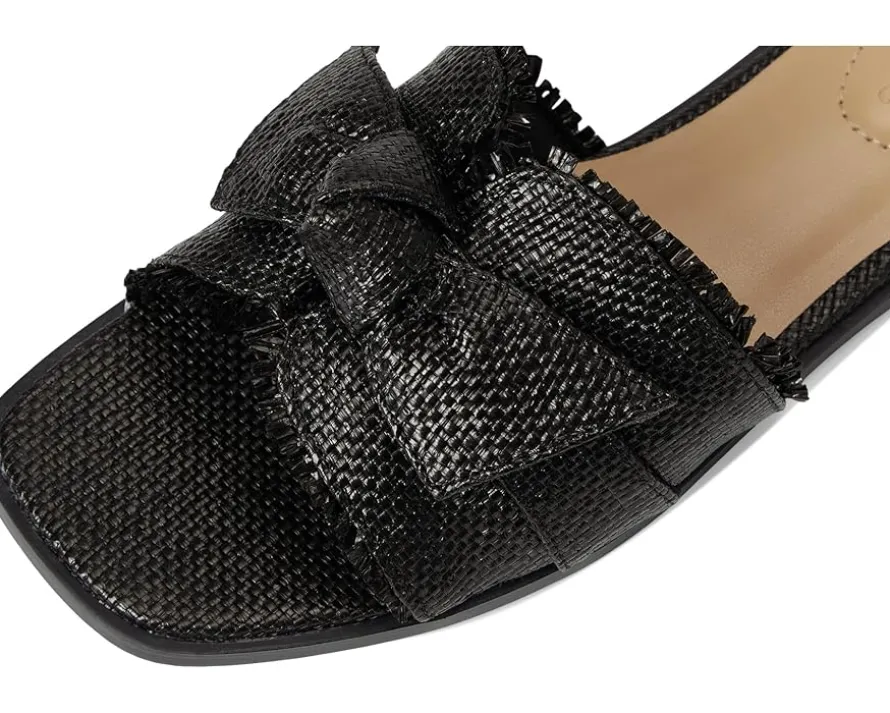 - The Bandolino® Vallen casual flats are your go-to style essential, blending modern flair with effortless wear. Crafted with a sleek PU upper and accented by an elegant bow detail, these sandals bring a feminine twist to any look. The open toe and contemporary square toe design elevate your everyday outfits with a trendy edge. Featuring a slip-on silhouette for easy wear, a soft polyester lining, and cushioned foam insole for all-day comfort, every step feels like a dream. The durable synthetic rubber outsole offers grip and flexibility wherever you go.