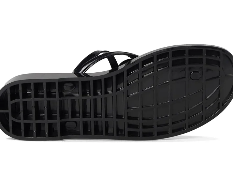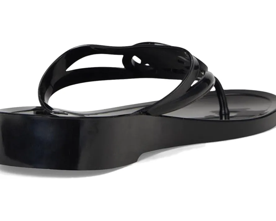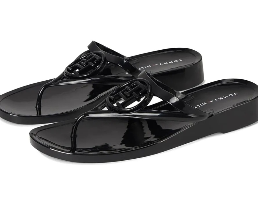 - The Tommy Hilfiger® Women’s Vedna jelly flip-flop with a low edge and instantly recognizable logo perfectly balances this signature style with a fresh attitude. Crafted from polyester upper, lining, and leather insole, this pair of sandals features open square toe, slip-on style, low-top silhouette, and brand detailing on the footbed.