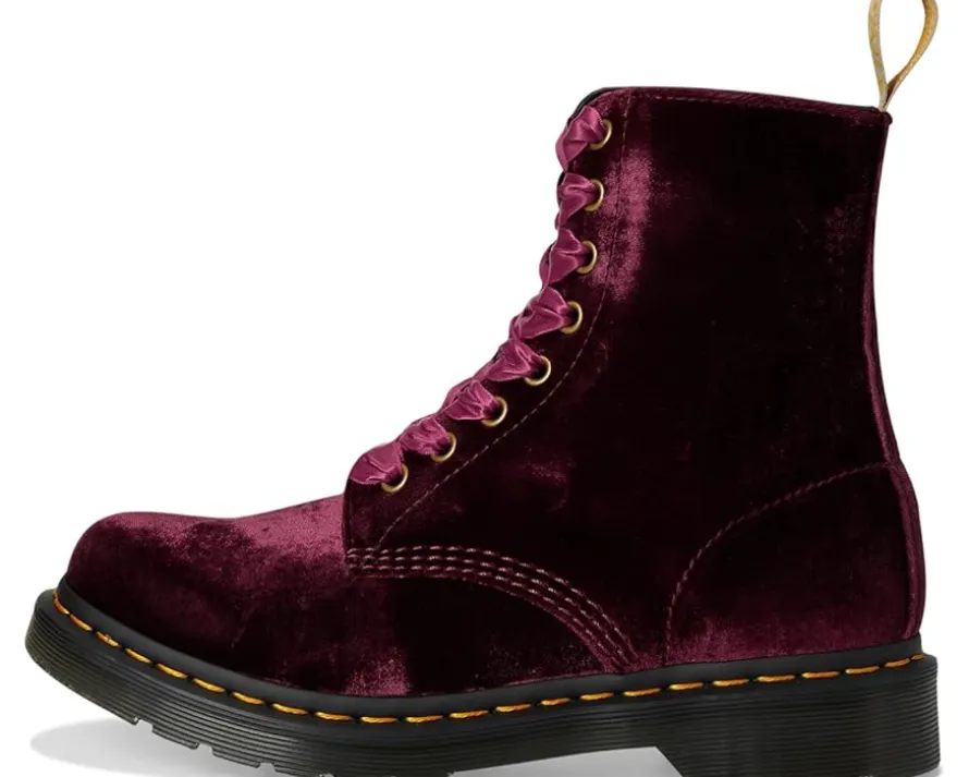 - An 80s revival of the classic 1460 boot. This Crushed Velvet upper is complimented by tonal ribbon laces and antique gold eyelets. The boot stands on the smoke DMS sole secured with yellow welt stitching and a distinctive cream heel loop.