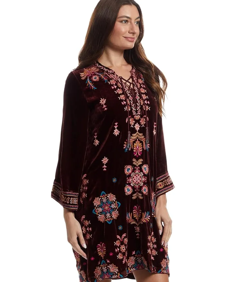- Velvet meets artistry in this Johnny Was® Velvet Tie Front Kimono Dress- Brandi, where lush florals and rich wine tones create an effortlessly chic statement. This embroidered tunic dress is styled with elbow-length sleeves, a split neckline, and a straight hem. Made from a rayon blend, this above-the-knee dress works for different occasions.