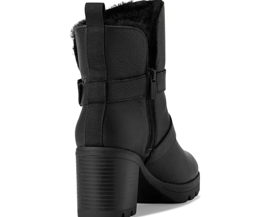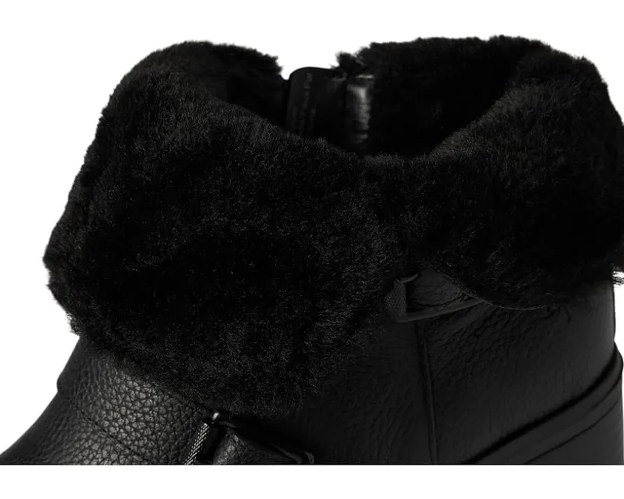 - Water-repellent ankle bootie with a fluffy lining, foldover topline and buckles.