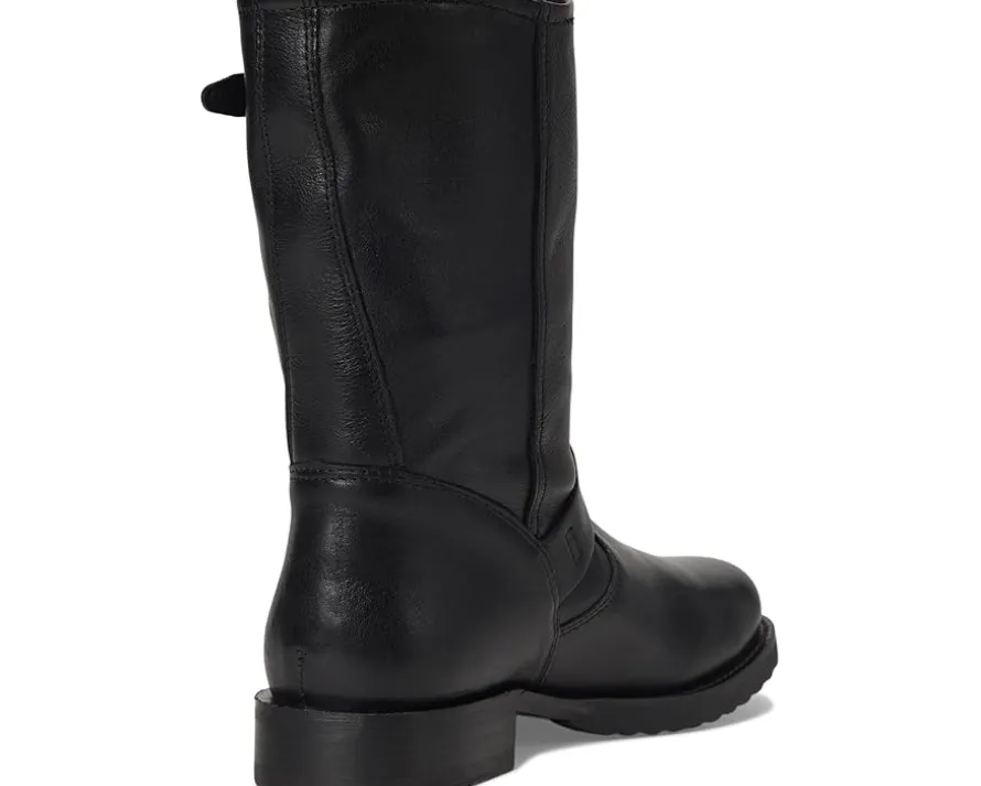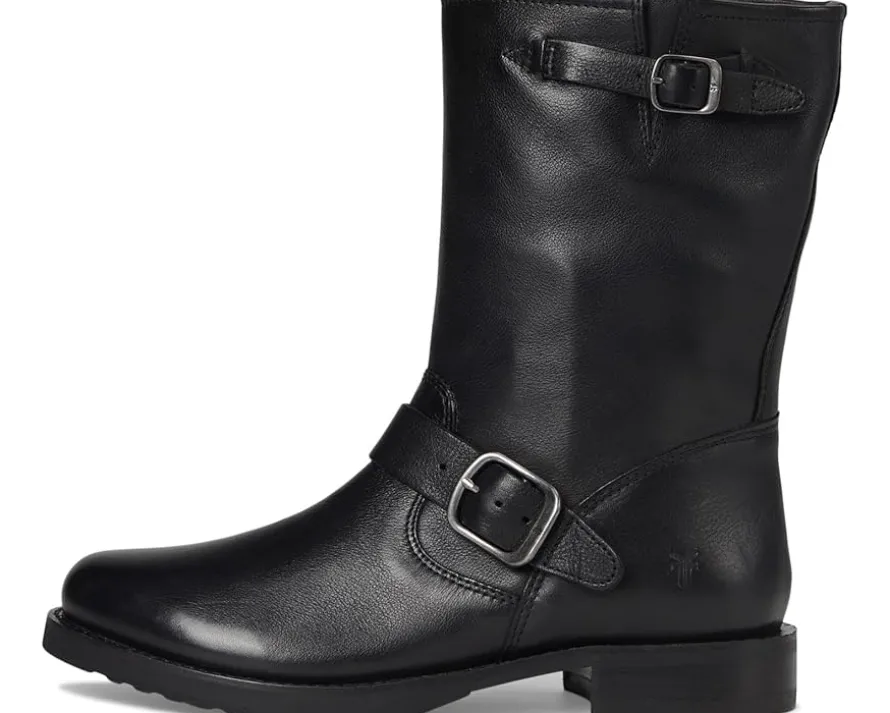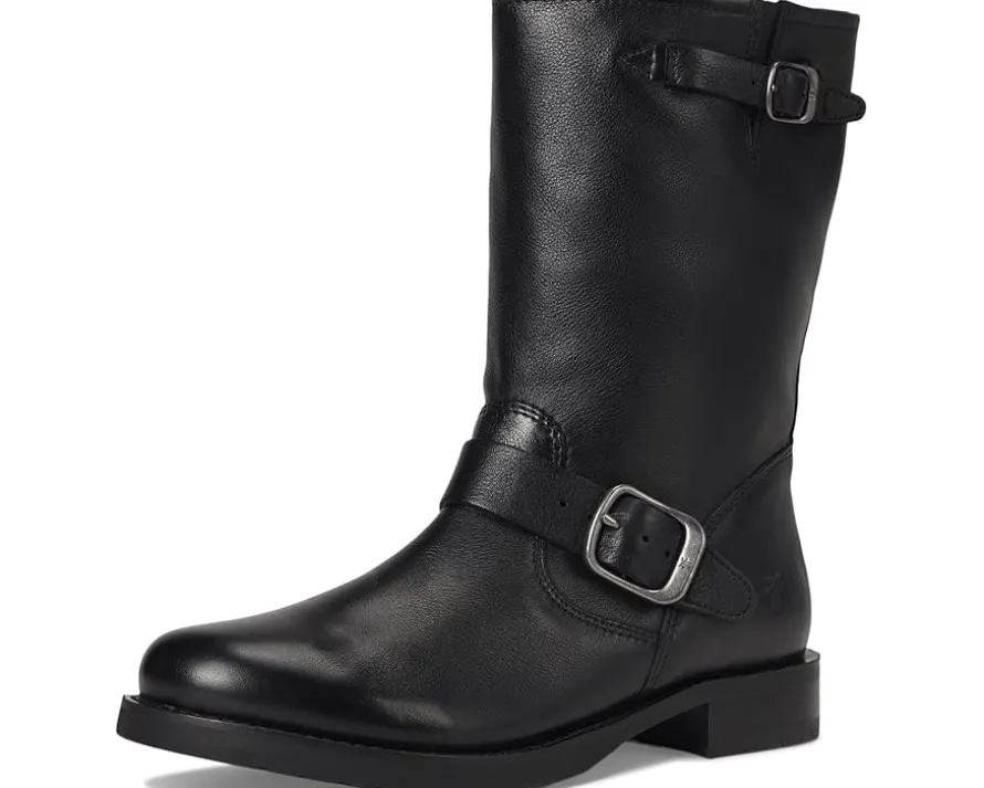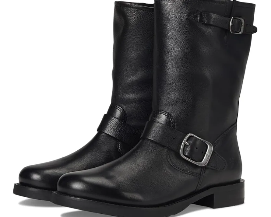 - Crafted for comfort and attitude, the Frye® Veronica Flex Short boots feature premium materials and a cushioned EVA insole for all-day wearability. These moto-inspired boots are made of a soft tumbled leather upper and leather lining. The adjustable buckle straps and elasticized gore panel on one side offer easy on and off. The mid-calf shaft, round toe silhouette, and chunky block heels pair effortlessly with rugged denim or casual looks, while the new Flex rubber outsole construction makes for out-of-the-box comfort.