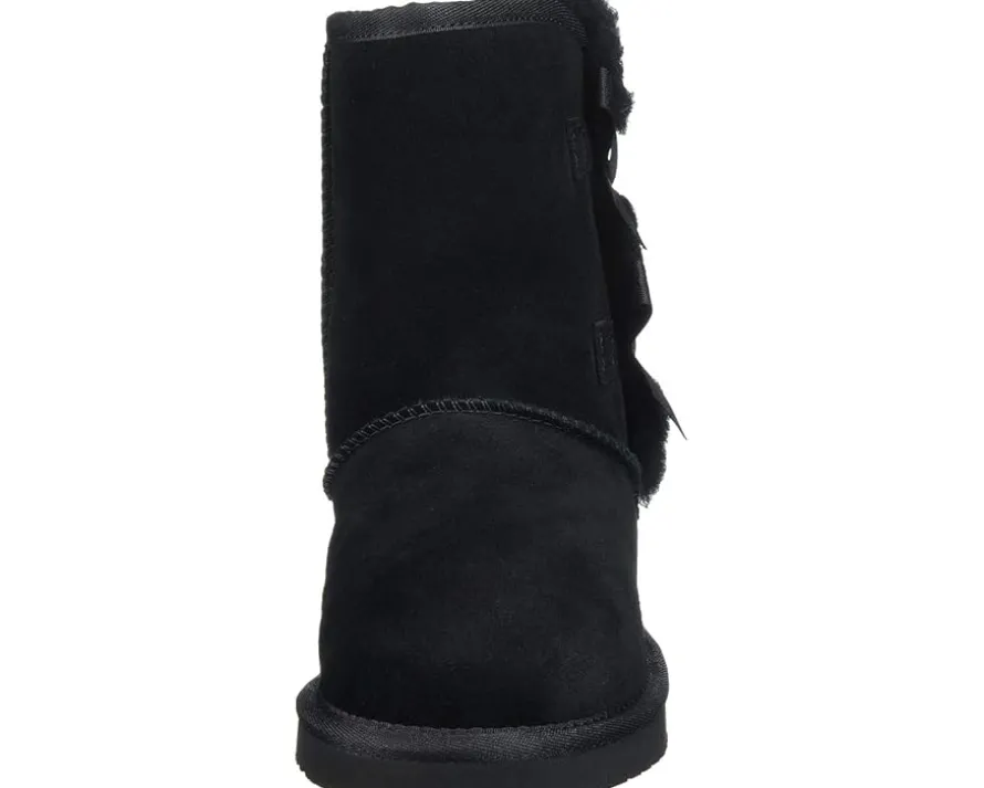 - Soft suede upper adorned with dainty bows and a row of plush, exposed sheepskin.