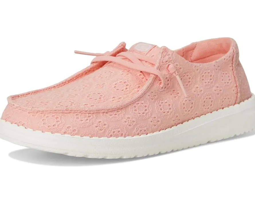- Comfort meets confidence in the Hey Dude® Wendy Eyelet Lace sneaker. These sweet, warm weather go-to’s feature a textured eyelet upper and a comfortable fit, letting you conquer your day in style. Wendy provides everywhere comfort but with a style ideal for women who enjoy life’s ever-changing journey. The relaxed look and feel allow you to explore your passions and experience new places with the confidence your feet will fit into any occasion. The removable memory foam cushioned insole provides maximum comfort and reduces sweating and odors.