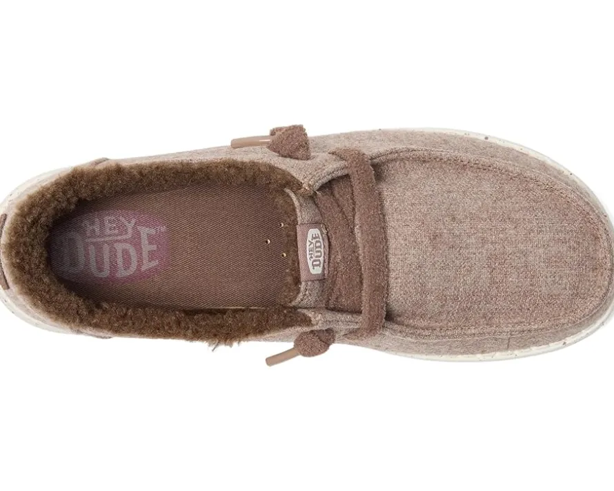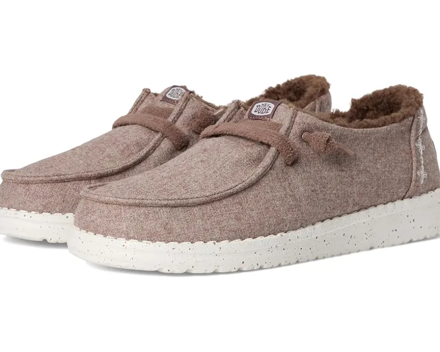 - The Hey Dude® Wendy Wool Cozy shoes are slip-on sneakers that are ready to roam. Their easy-on elastic laces offer a secure fit, while the polyester upper features a Flex & Fold design that supports healthy feet with their unique shape, giving complete freedom of movement. They are made of an EVA insole and a polyester lining.