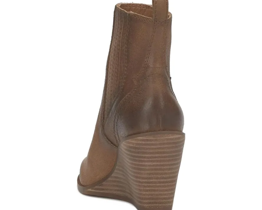 - Wedge bootie of the season! The Lucky Brand® Wilano has a burnished suede upper and exposed stack wedge heel, keeping this dressier silhouette casual and cool. The pull-on footwear features an ankle-high silhouette with pleated gore panels and heel pull tabs for easy wear.