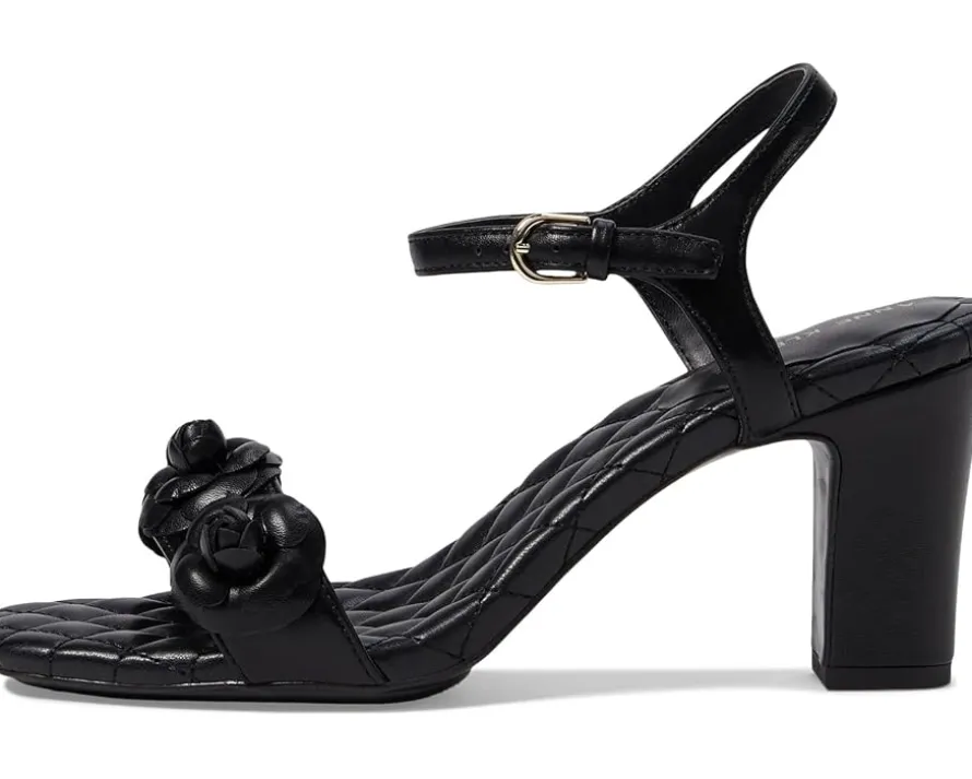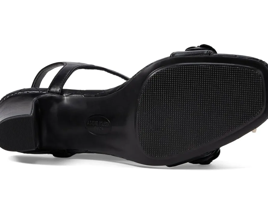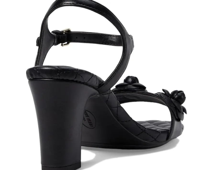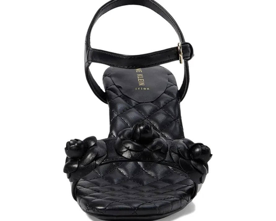 - Unlock your inner diva wearing the chic and classy Anne Klein® Yardley. Crafted from man-made upper, lining and insole, this pair of stylish sandals features open square toe, block heels, eye-catching flower embellishment on the top, ankle strap with buckled closure and cushioned footbed. It comes with brand detailing on the footbed.