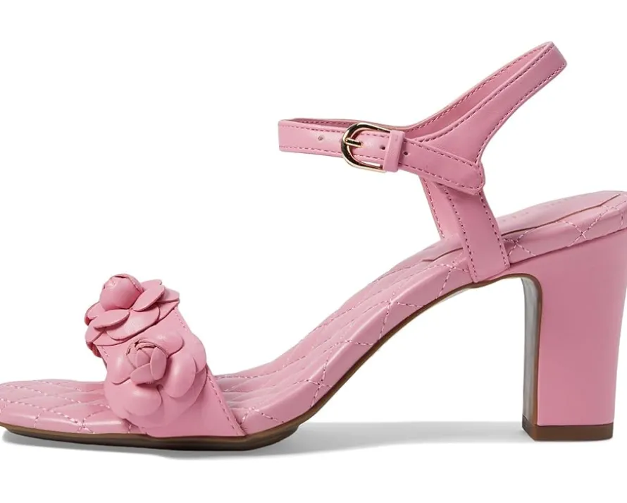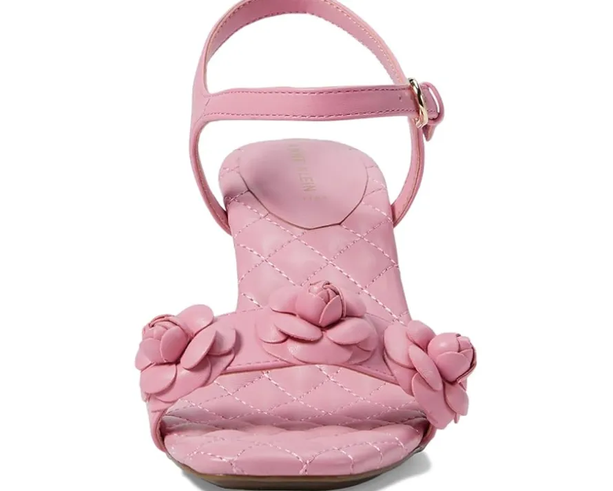 - Unlock your inner diva wearing the chic and classy Anne Klein® Yardley. Crafted from man-made upper, lining and insole, this pair of stylish sandals features open square toe, block heels, eye-catching flower embellishment on the top, ankle strap with buckled closure and cushioned footbed. It comes with brand detailing on the footbed.