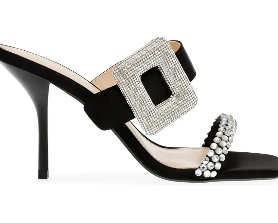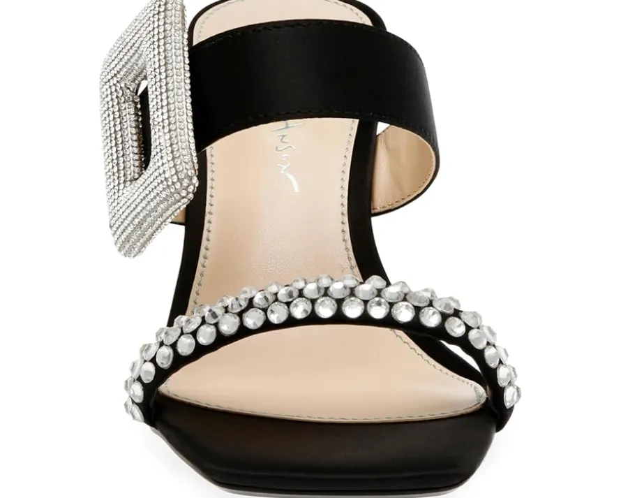 - Walk like a diva on the red carpet by wearing Blue™ by Betsey Johnson Anny sandals. They are crafted from satin upper, synthetic rubber lining, and synthetic insole. A slip-on style, rhinestone embellished toe strap with oversized rhinestone buckle on top strap, and open square toe silhouette makes the sandal unique in the crowd.