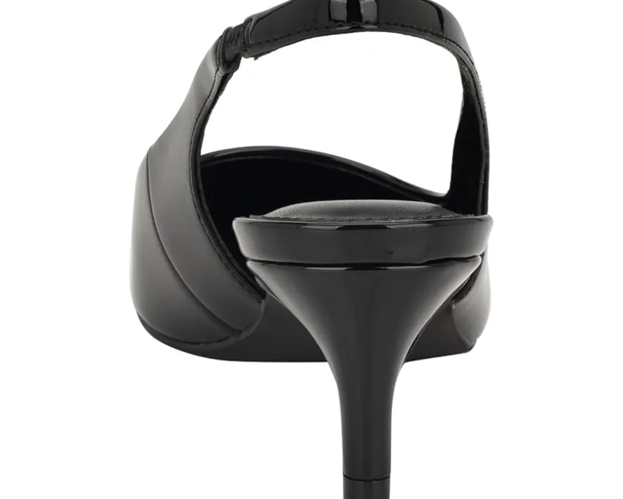 - Be ready to jealous your friends at the party by wearing the stylish and trendy Calvin Klein® Dainty heels. These kitten heels are designed with pointed toe design, elasticized slingback strap closure, and faux patent leather upper.