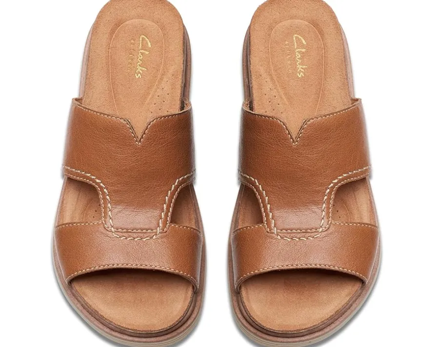 - Celebrate outdoor fun in style wearing the Clarks® Arwell Walk Sandals. The slip-on footwear features leather upper construction with polyester lining and open almond toe silhouette.