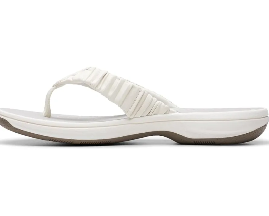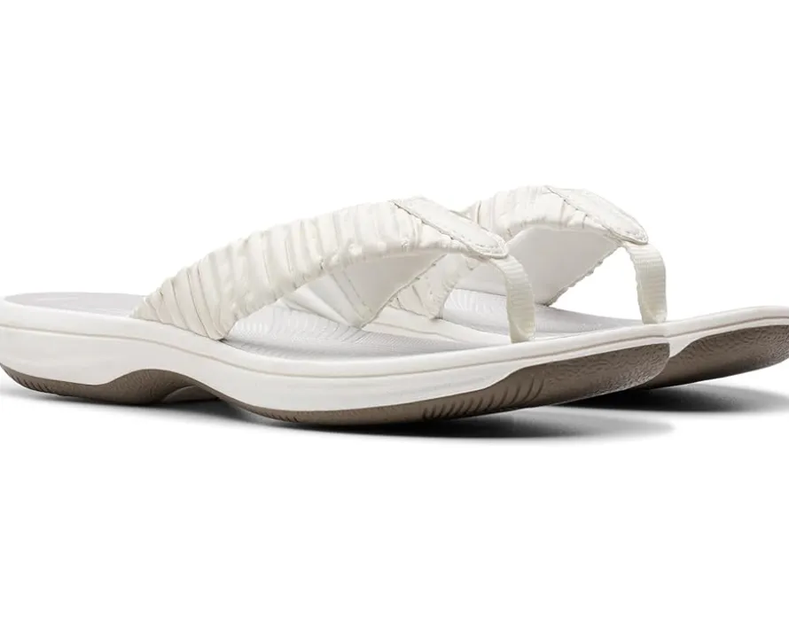 - Be classy and sassy donning the Clarks™ Breeze Rae. These thong-style flat sandals feature slip-on construction, nylon upper, and allover ruched detailing on the straps. Wear this flats with your shorts to get a modish look.