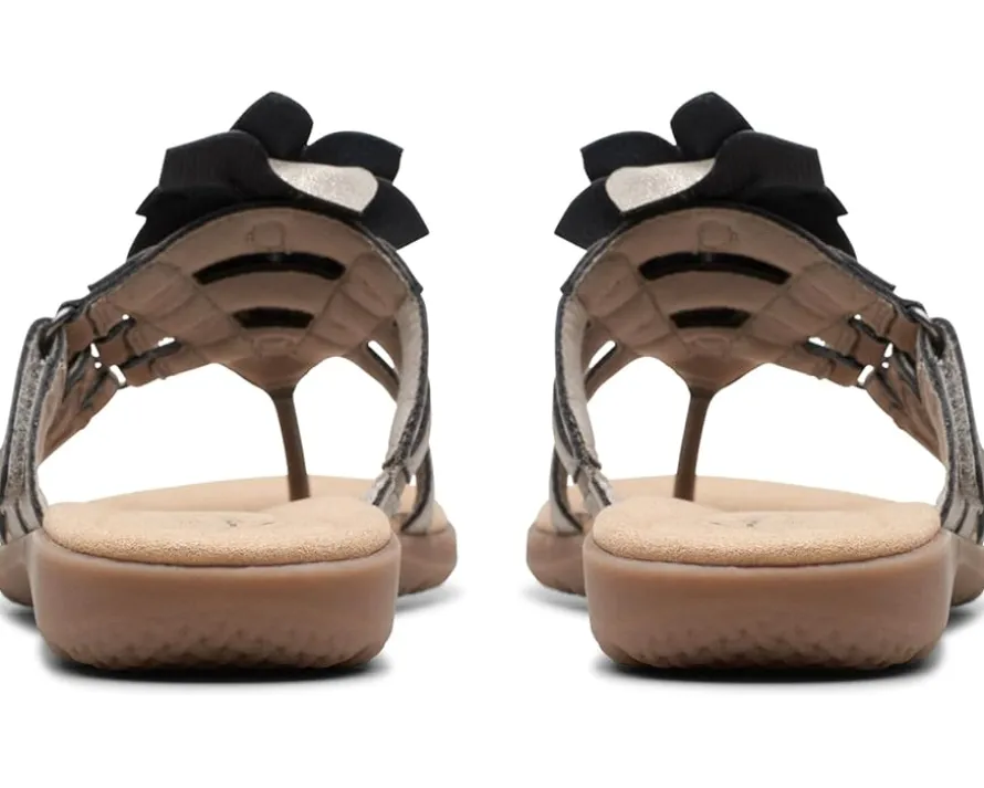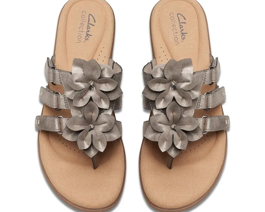 - Crafted with a leather upper with cut-out flower detailing, the Clarks™ Elizabelle Mae sandals offer a chic look. Offering superior comfort and style, the padded rubber footbed and mesh lining take your comfort to the next level. Easy to slip on and off, these toe-post style sandals feature a hook-and-loop strap closure that offers a custom fit. Flaunt your great style by wearing these stylish sandals.