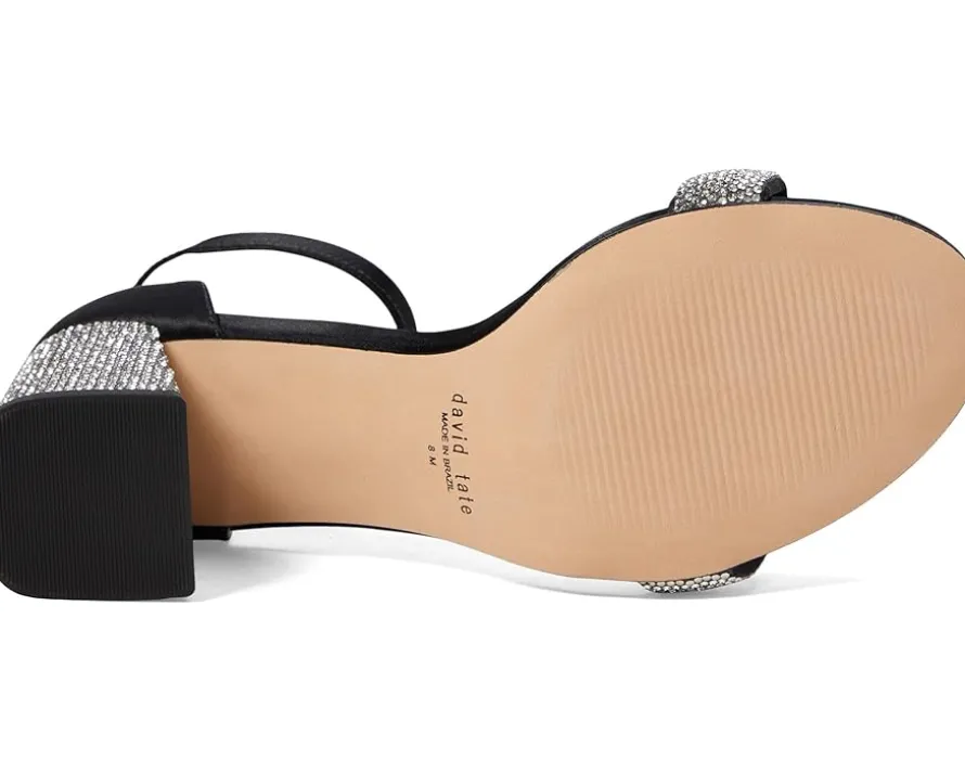 - A gorgeous and glamorous pick for your evening parties, the David Tate® Icon Heels showcase a premium quality satin upper perfectly teamed with shimmery rhinestone embellishments on the toe strap. Equipped with a feminine buckle strap closure at the ankle, the shoes look more stylish with the high quality sockliner made with satin, suede, and soft leather and surrounded by a metallic frame. The rhinestone-covered block heel lifts your look with some added charm.