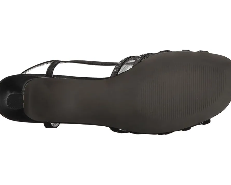 - Strappy satin uppers with decorative rhinestones and an open toe.