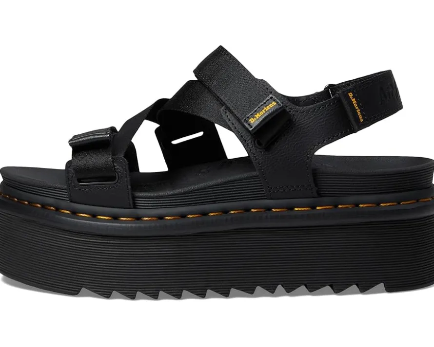 - The Dr. Martens® Kimber II sandals are designed to offer superior comfort and a bold look. The strappy PU-coated leather upper features multiple riptape straps that provide you with a secure fit. These sandals are crafted with a leather insole and lining. Finished with yellow stitching and Goodyear welt construction, these platform sandals offer superior comfort and durability.