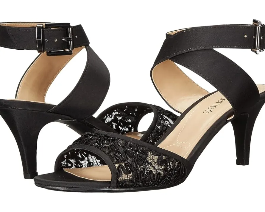 - Available in multiple materials with an open toe and wrap-around straps at ankle.