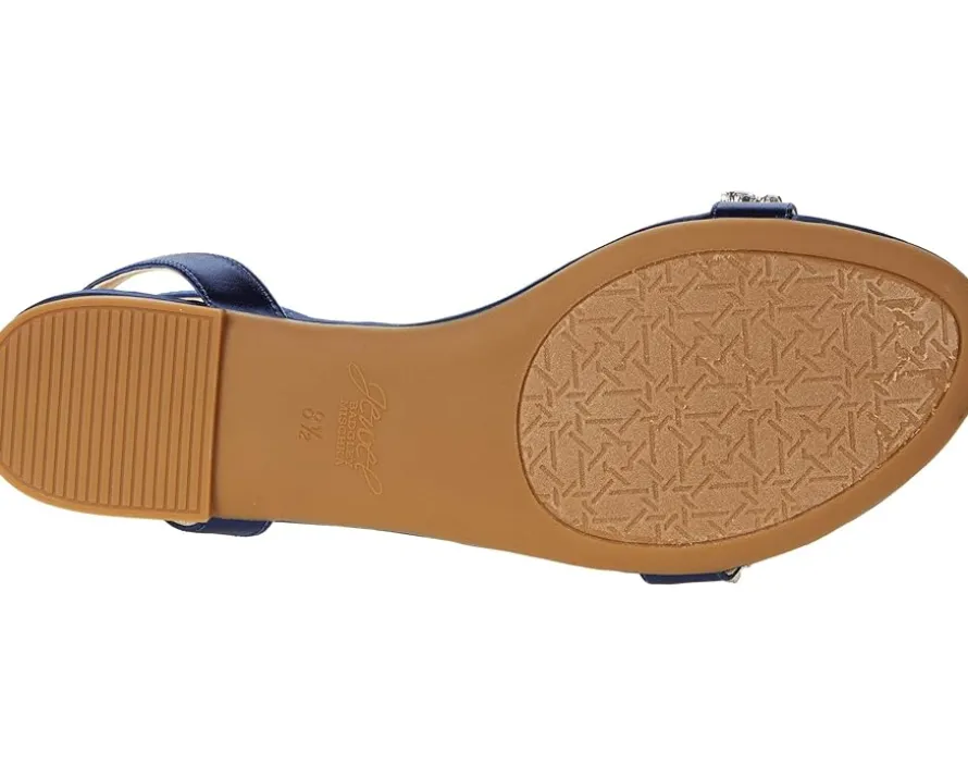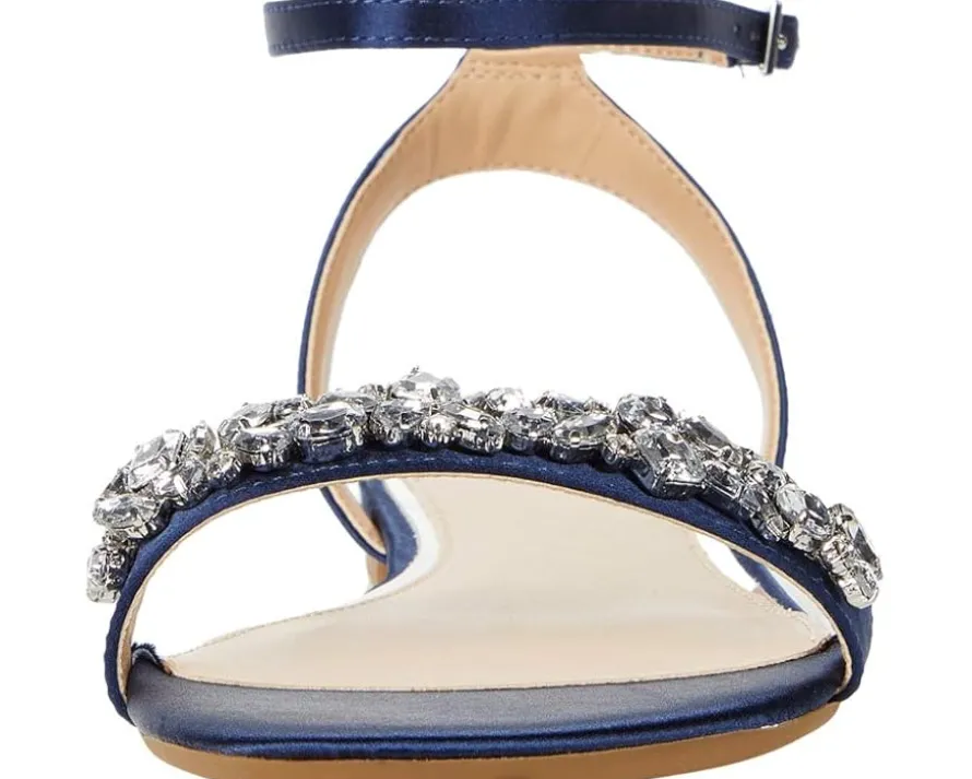 - Stylish strappy sandal features soft textile upper with open toe. Crystal embellishments across the toe straps will catch the sun for extra shine!