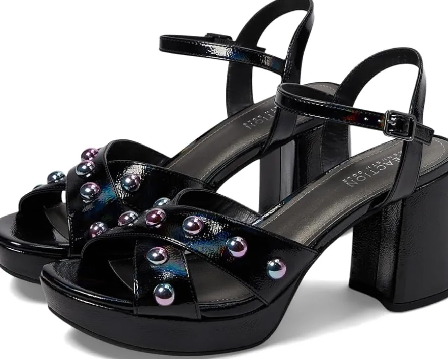 - Nothing can replace the Kenneth Cole Reaction® Reeva Stud Heels when you wish to lend a gorgeous and elegant finish to your evening look. Displaying sleek crossover straps with embellished studs and elevated by a lofty block heel, the shoes are formed with man-made upper, lining, and insole. They possess an open round toe design and an adjustable buckled strap closure at the ankle for a custom fit.