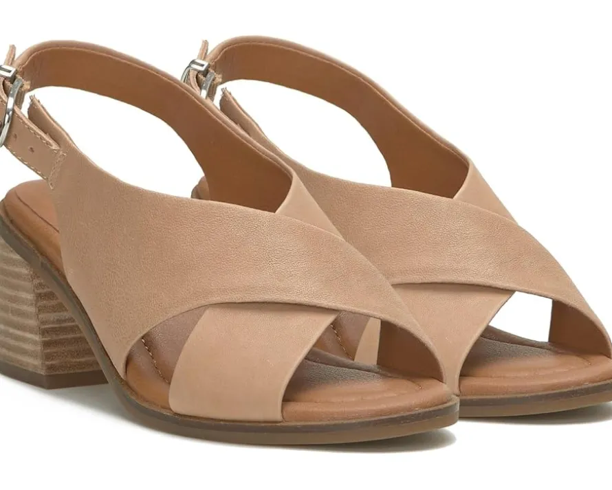 - Feel the extreme comfort wearing the Lucky Brand® Rhidlee. Crafted from leather upper, synthetic lining, and polyester insole, it features crisscross vamp strap detailing, buckled closure, block heel, and round toe design.