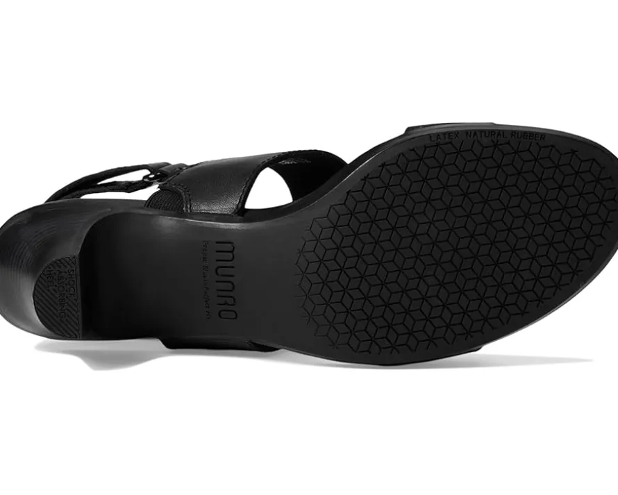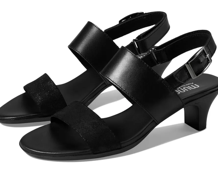 - Let your feet feel comfortable by taking every step in the Munro® Livia. The slip-on sandals have a double band with a hook-and-loop adjustable backstrap under the buckle, an open almond-toe design, and kitten heels. The sandals have a leawood insert at the heel for a relevant timeless texture. The mid-heel height sandals have leather upper, faux suede lining, padded silhouette, and leather insole for added comfort.