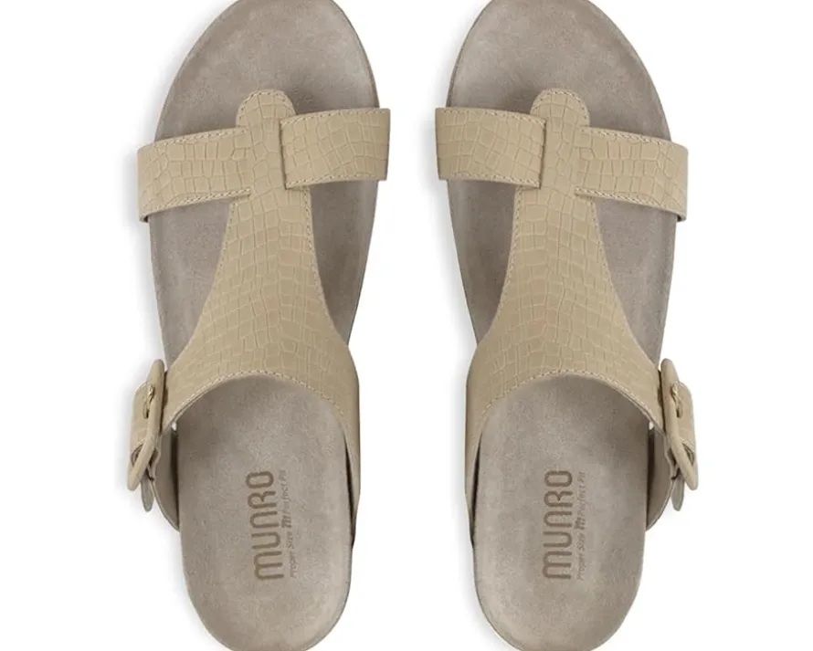 - Let that contemporary take on fashion define your style as you wear the Munro® Ronda Flat Sandals. The slip-on footwear features suede upper construction with T-strap, buckle detail, and open toe silhouette.
