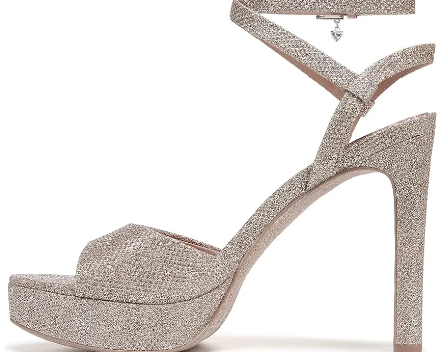 - Adjustable buckle closure on the ankle strap with heart charm embellishment.