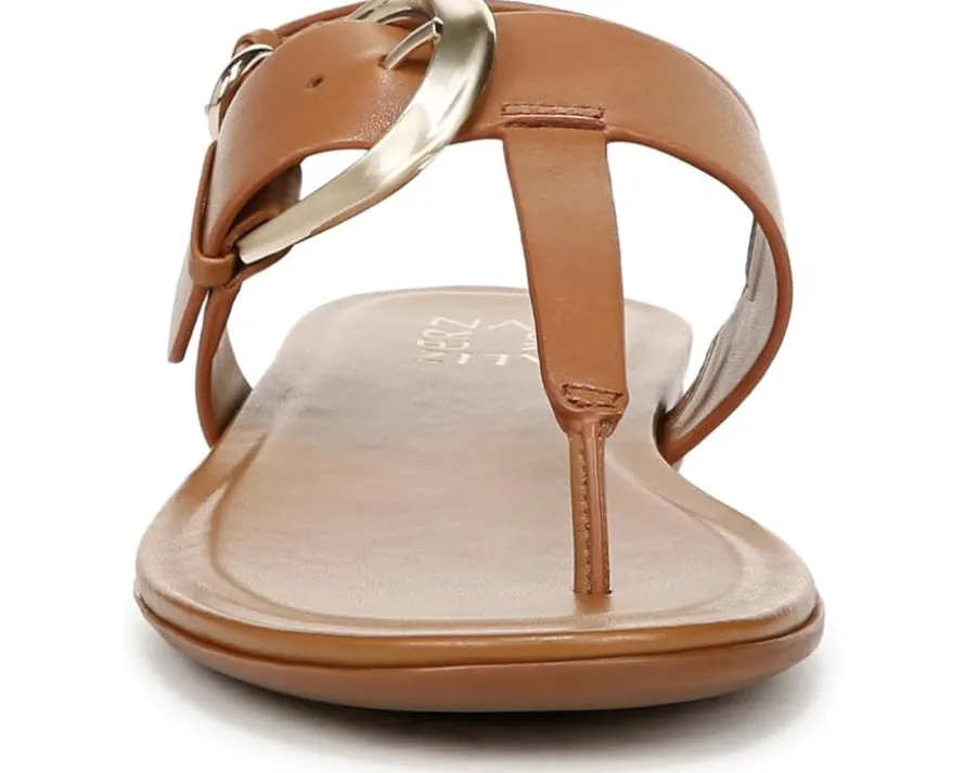 - From casual outfits to party dresses, the Naturalizer® Taylor Slingbacks are perfect to pair with different outfits and styles. The Contour+ Comfort technology of these flats provides all-day comfort. These flat sandals are crafted with foam insole and polyurethane lining. The metallic leather upper features a T-strap styling and an oversized adjustable buckle that provides a perfect fit. Make your style statement wearing these flat leather sandals.