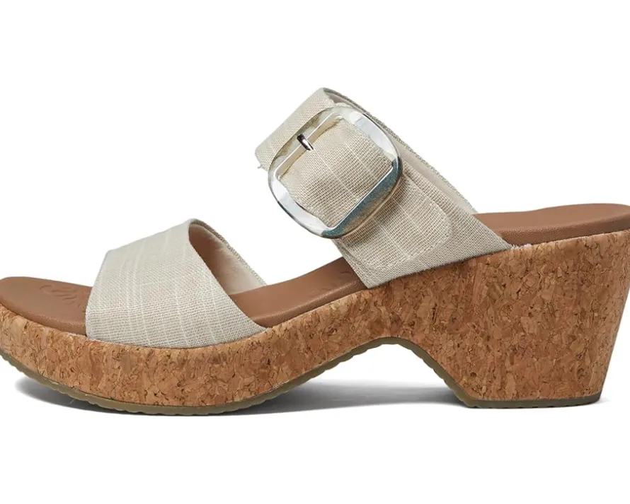 - Give your casual looks a stylish update wearing the SKECHERS® Brystol Sandals that are crafted with vegan materials and feature double band slides with adjustable buckle. The sandals are crafted with a linen canvas upper, fabric lining, luxe foam® cushioned comfort footbed, and cork wrapped midsole.