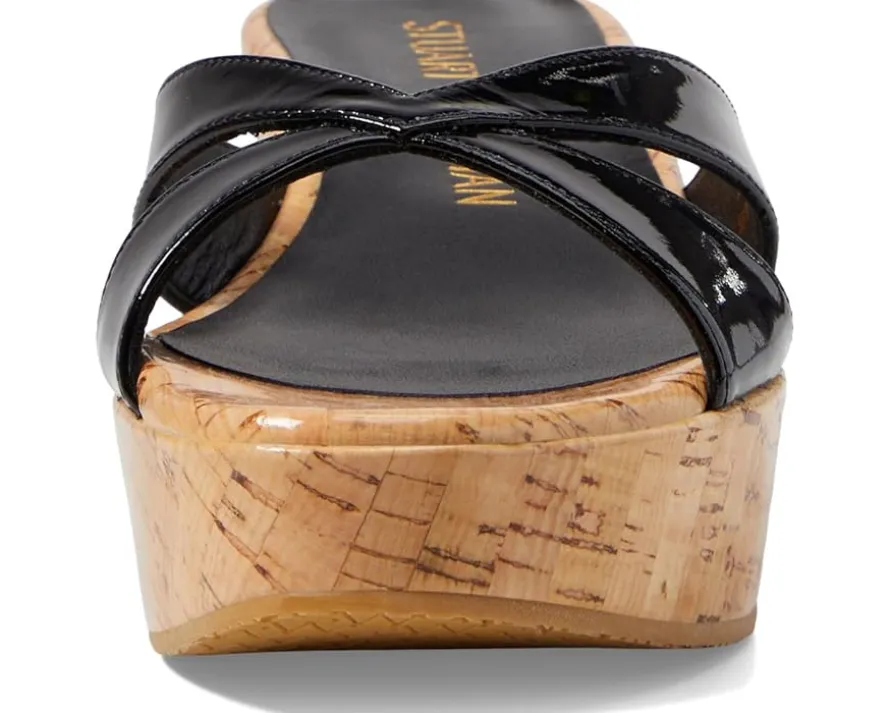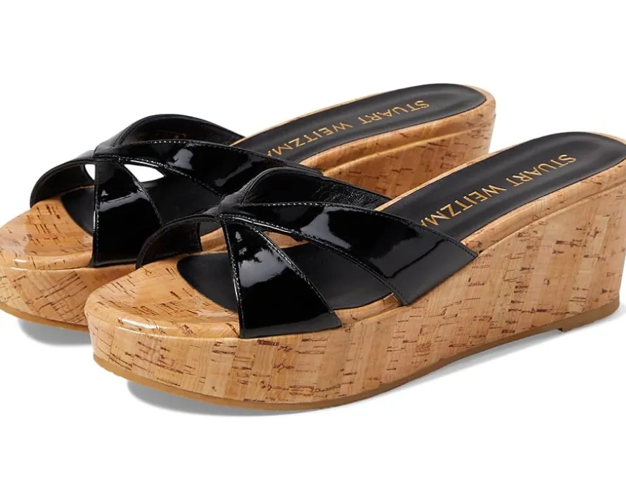 - Keep life on the go without worrying about the fatigue wearing Stuart Weitzman® Carmen Platform Slide footwear. It features patent polyurethane coated calf leather upper, TPU lining, and synthetic rubber insole. A slide-on style and strappy vamp with wedge heel offers elegant look while walking.
