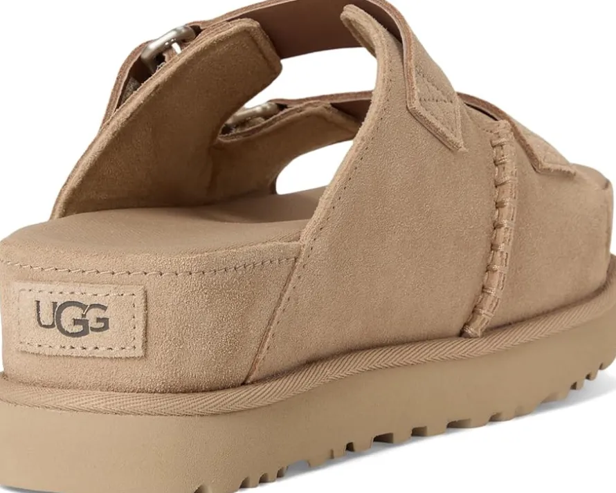 - Step up your shoe game by choosing the UGG® Goldenstar Hi Slide. Boasting a sleek and padded leather upper, these flat sandals offer a trendy look that effortlessly elevates any ensemble. The mesh lining offers a breathable experience and the dual-density foam footbed provides exceptional cushioning and support for all-day wearability. The adjustable vamp straps and convenient hook-and-loop closure allow you to always achieve the perfect fit.