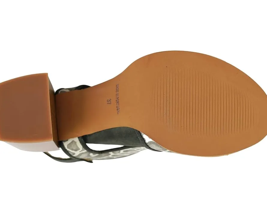 - Open toe and stacked block heel.