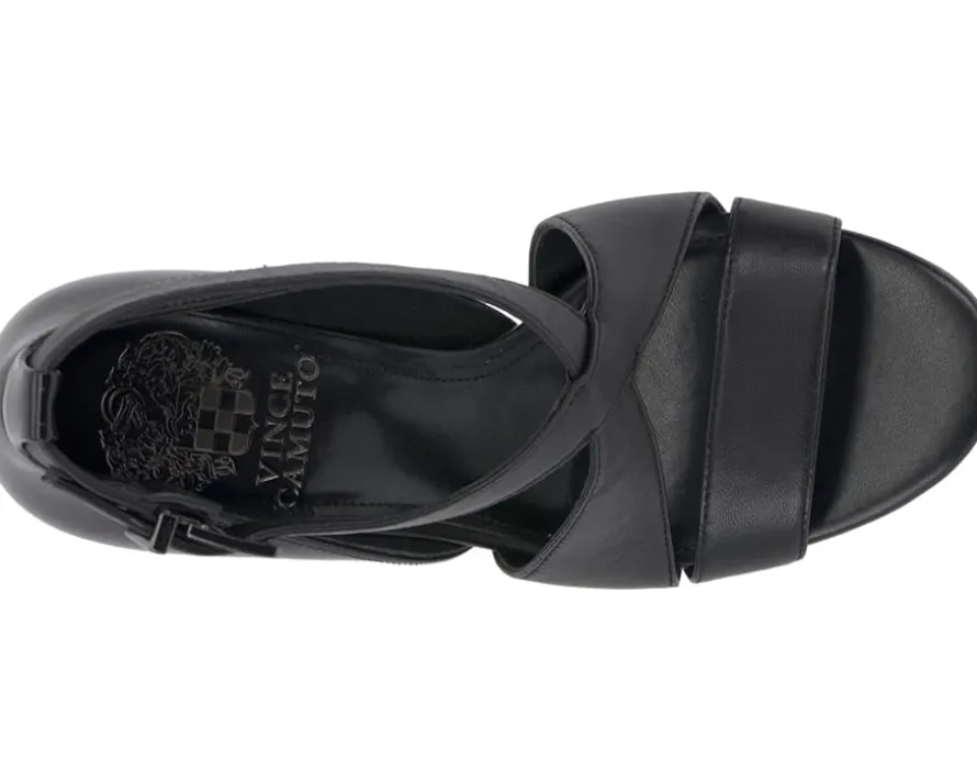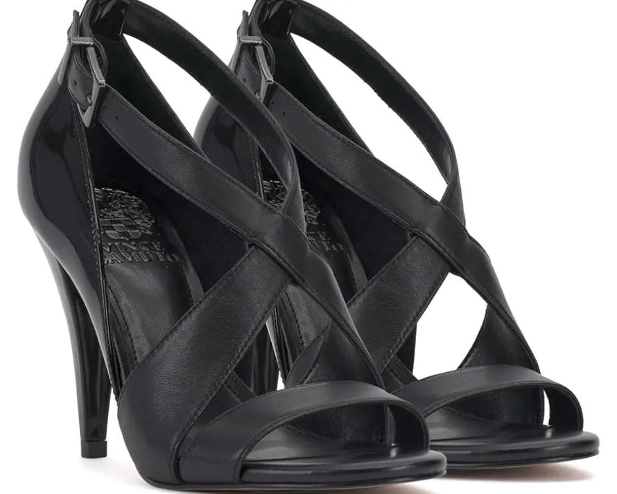 - Experience top-notch solace and look classy wearing Vince Camuto® Aleanna heels. It is designed with crossover vamp straps, stiletto heels, and an open round toe design. The adjustable ankle strap buckle offers you a custom fit.