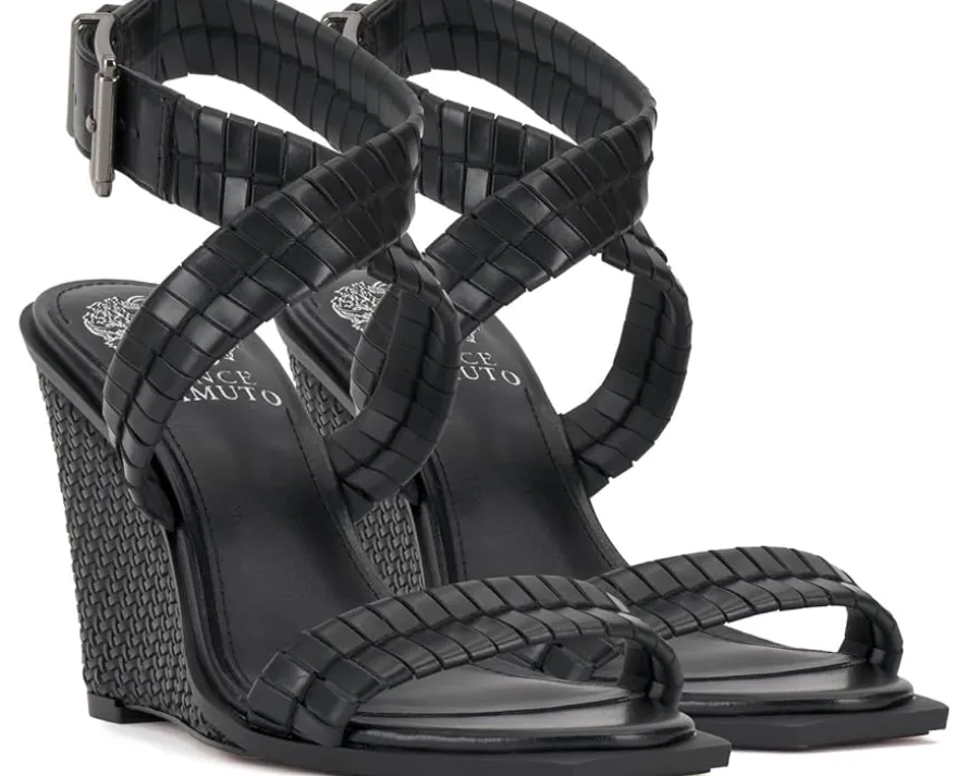 - Move into artisanal elegance with Vince Camuto® Elynna, where sleek style meets comfort. The wrapped and stitch straps exude craftsmanship, leading to a single forefoot band and a crisscross ankle wrap with a secure buckle closure. The wood or woven wrapped wedge complements any outfit, making it perfect for summer suits or floaty frocks. Crafted with a synthetic insole for added comfort, Elynna ensures you stride with confidence and style.