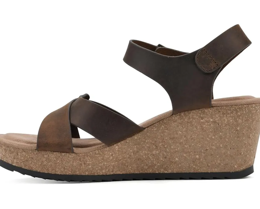 - Let comfort guide your journey as you wear the White Mountain® Prezo Sandals. The almond toe pair features leather upper with cross strap design, unlined construction, and adjustable hook-and-loop ankle strap closure.