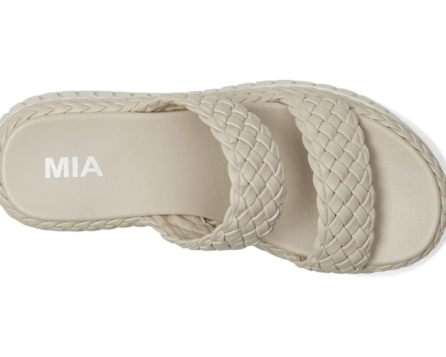 - Give your feet the comfort they deserve while still looking pretty in the MIA™ Yoshi Sandals. The open round-toe, slip-on style sandals are crafted with a faux leather upper with two braided straps. The faux leather lining and anatomical faux leather insole improves the comfort, while the wedge heel detail elevates the style statement.