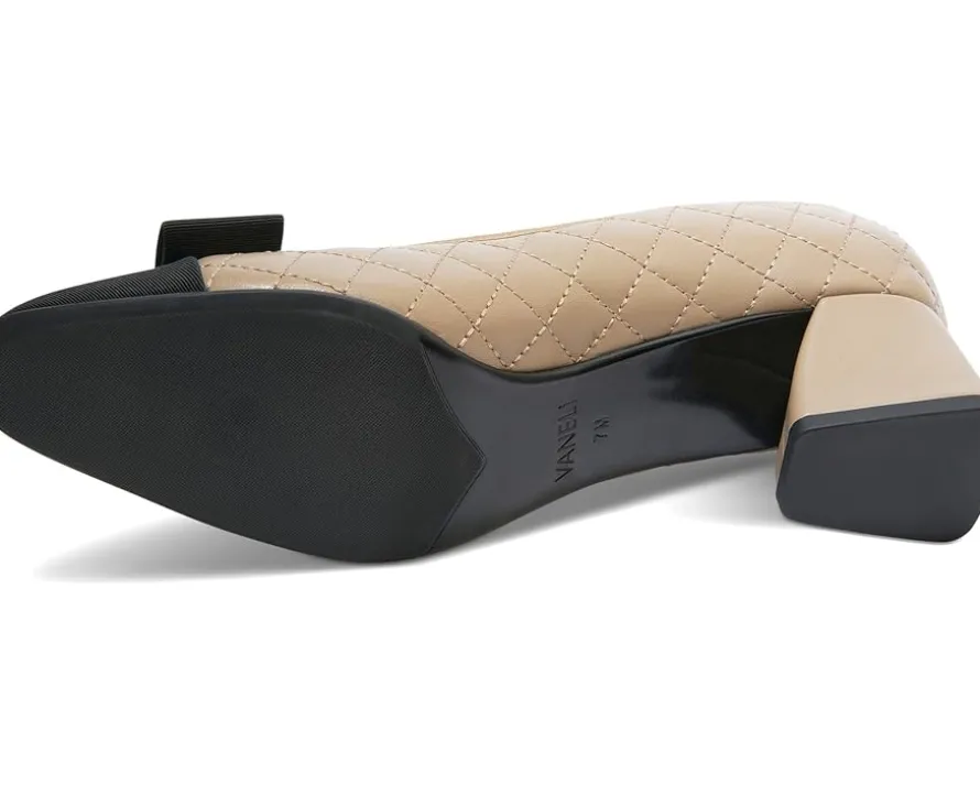 - A sculpting bow and diamond quilting pattern give the Vaneli® Zander Pumps a classic look. The slip-on footwear features leather upper construction with a block heel and almond toe silhouette.