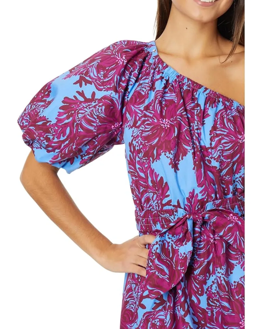 - Crafted from a soft-knit design, the Lilly Pulitzer® Zelalynn One Shoulder Cotton Dress has a flowy feel. The one-sided off-shoulder look complements the floor-length silhouette. The elastic detail on the shoulder line adds structure to the short puff sleeve on one side.