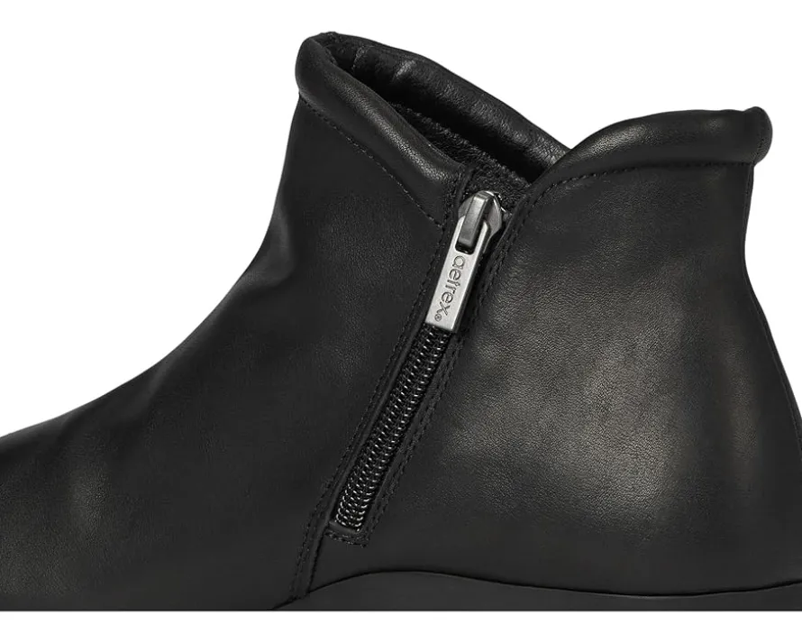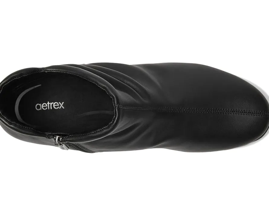 - Made for the Journey, Styled for the Spotlight, the Aetrex® Zoey is crafted from suede upper, polyester lining, and EVA insole. The Aetrex Orthotic System is built-In to every pair and features arch support that helps to stabilize your body, align your feet and relieve common foot pain. It comes with a closed round toe, mid-top silhouette, wedge heel, and zippered side closure.